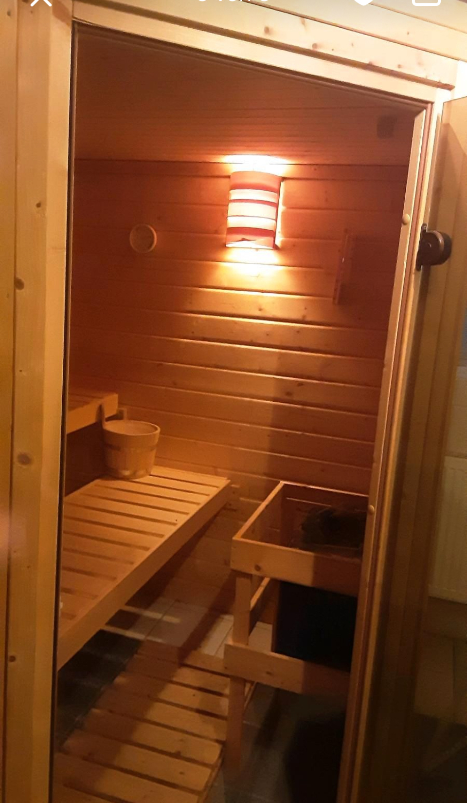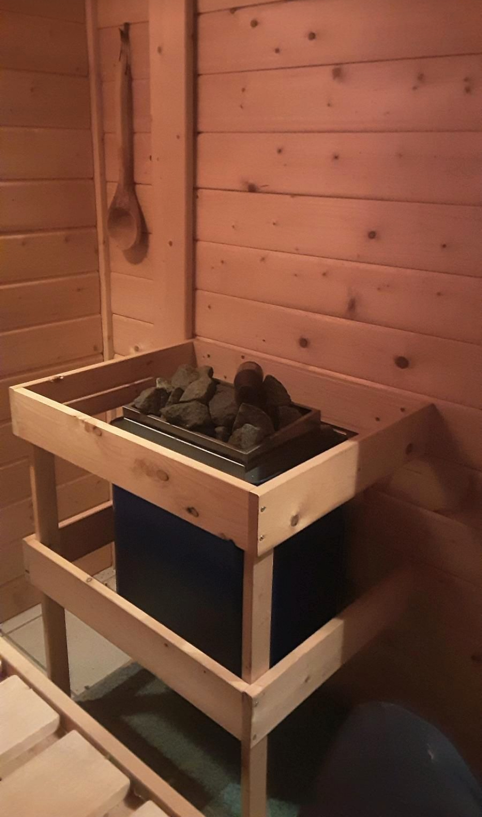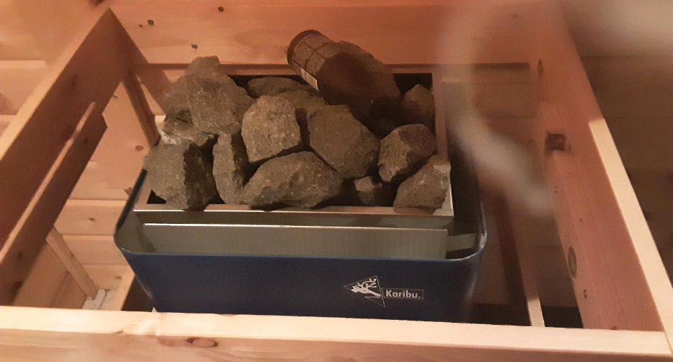Saunové kamna o výkonu cca 7,5 kW/380v,lávové kameny .Dveře bezpečnosti sklo bronz.Strop izolovaný minerální vatou+palubky.