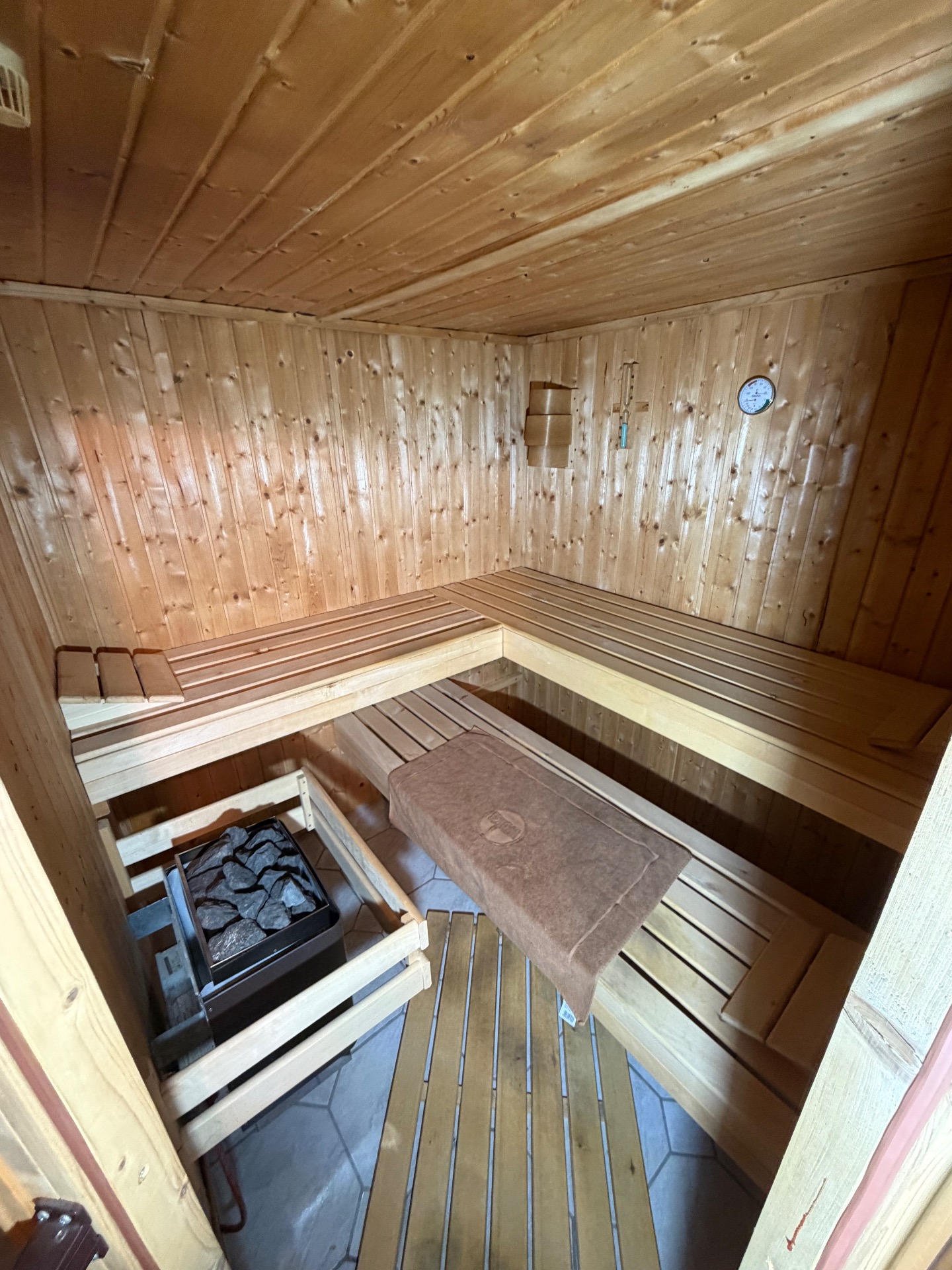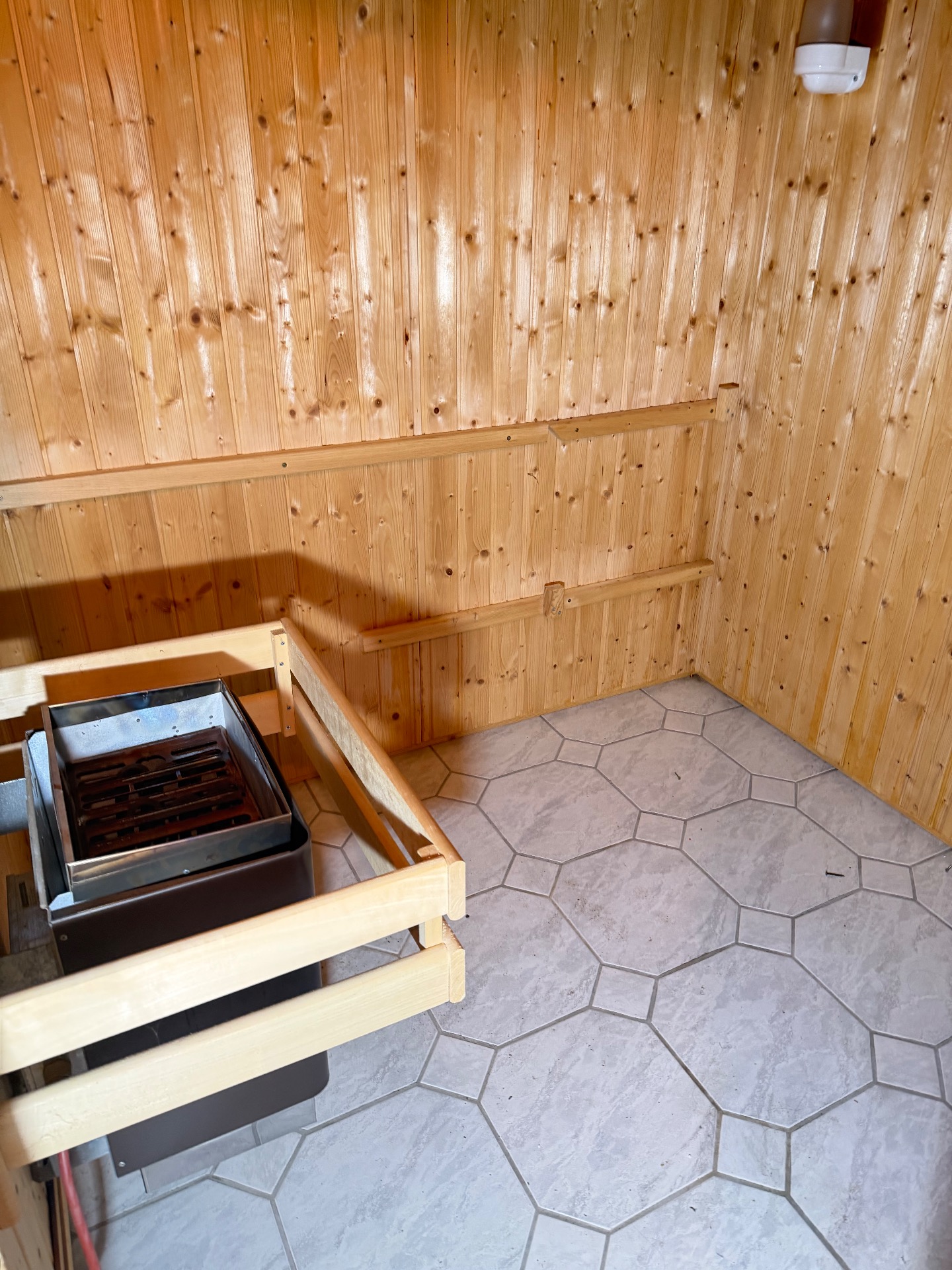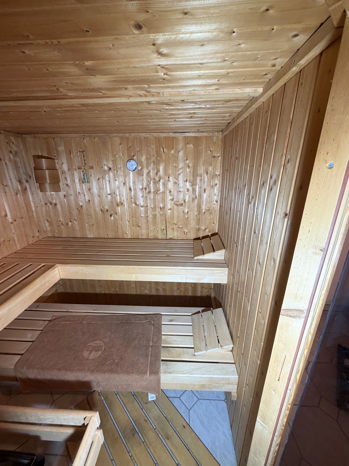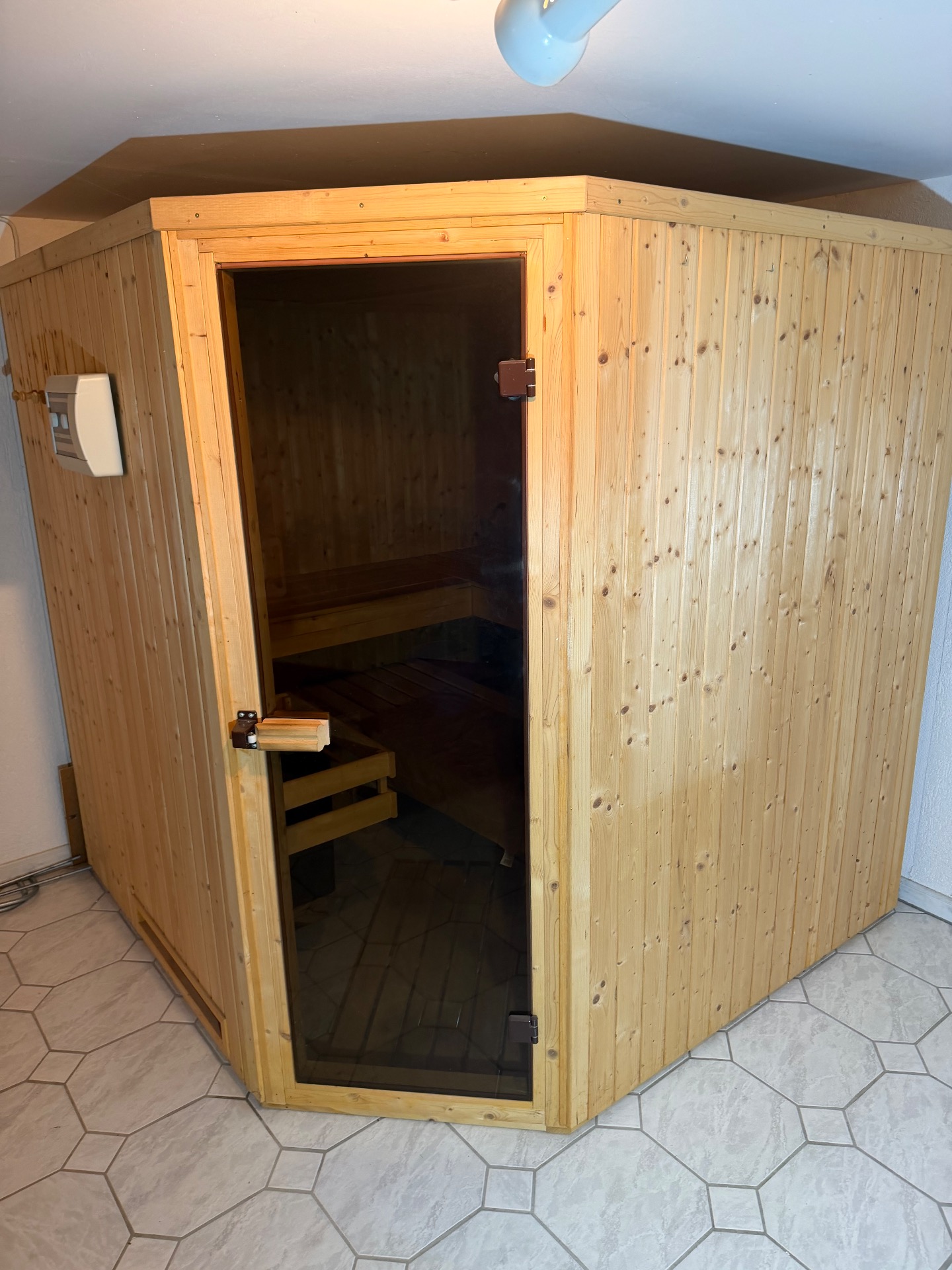 Rozměr 192x192x198cm,zateplená minerální vatou a alu folii, kamna 7,5 kw s externím ovládáním,3 lehátka nat.abaschi, teploměr,přesýpací hodiny, lávové kameny.Dveře bezpečtnostni sklo bronz.Zateplení minerální vatou.Vnitřní osvětlení.Operky hlavy,rohož na zem.