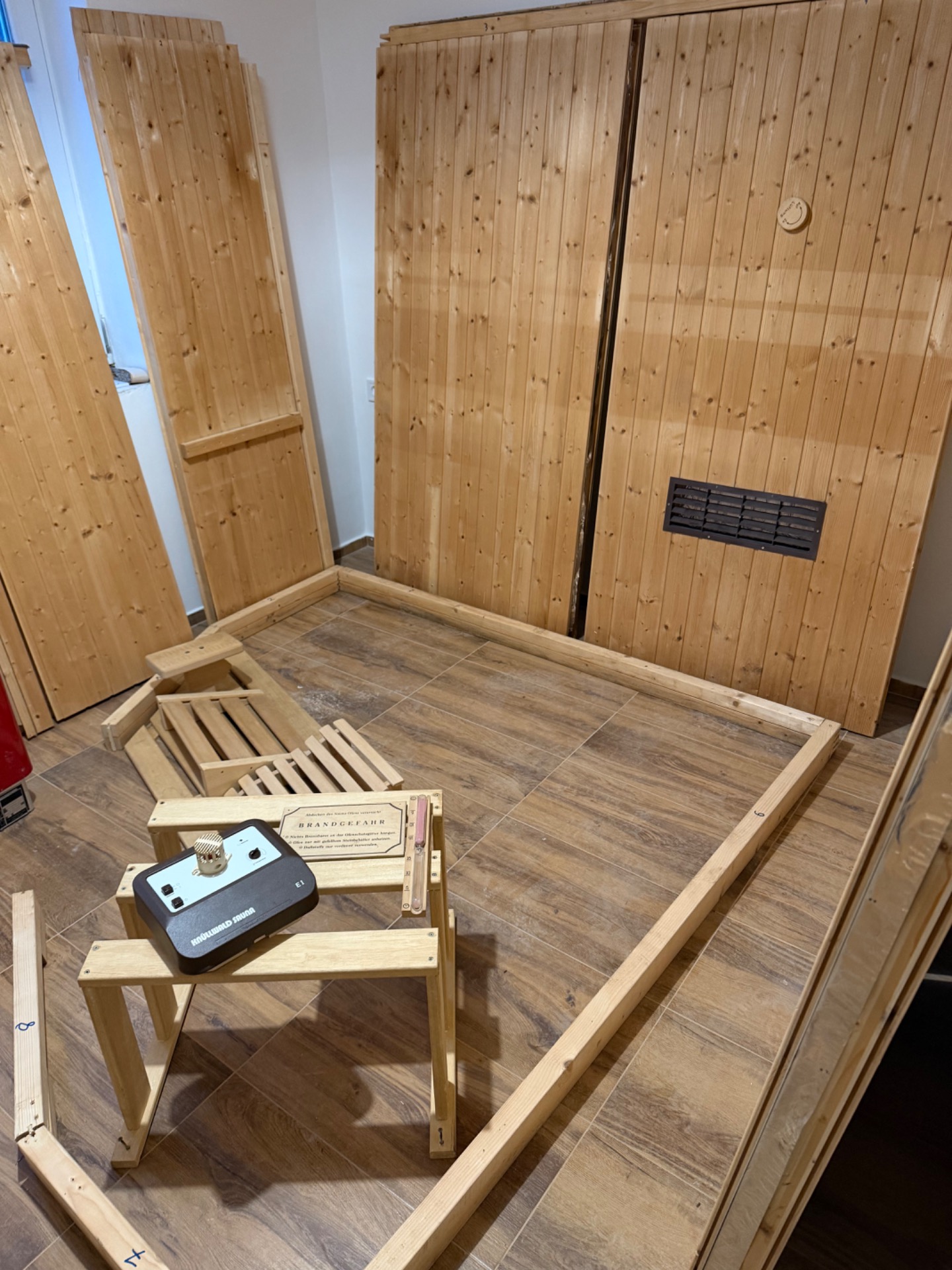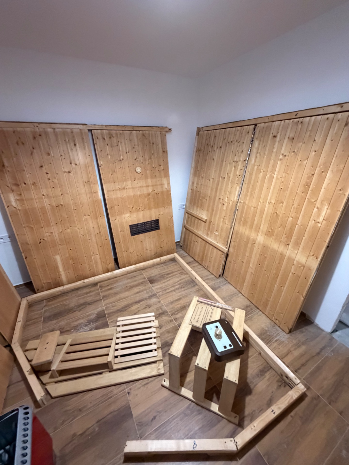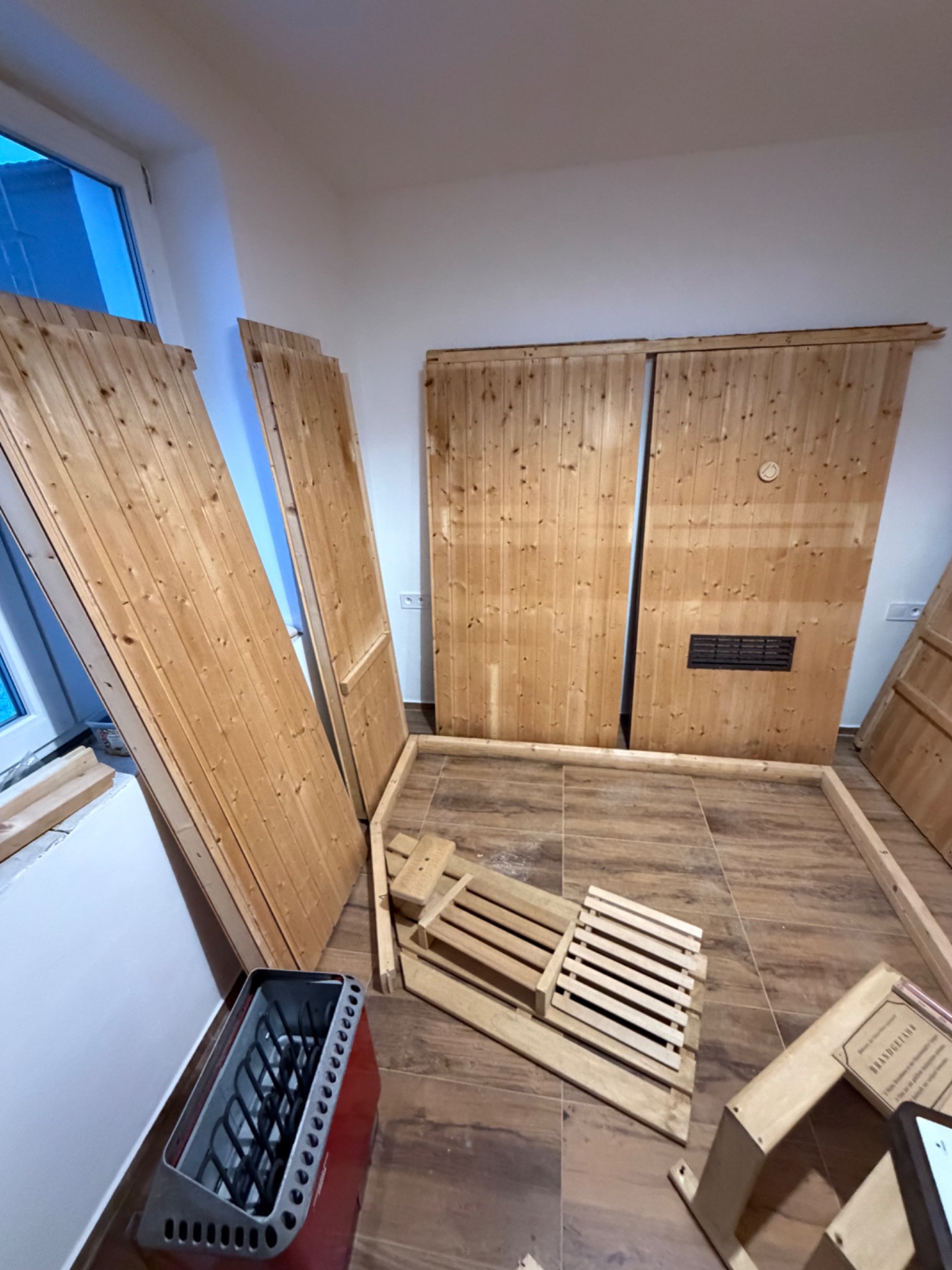 Kompletní demontovana sauna.Postavení vyžaduje zručnost.Predni steny bílá barva(jde dobre zbrousit.Kamna 6kw/380v s externím ovladačem a čidlem.Dveře bezpečnostní sklo bronz.Součástí rohož,opěrky zad,lehátka,přesýpací hodiny,opěrky hlavy.