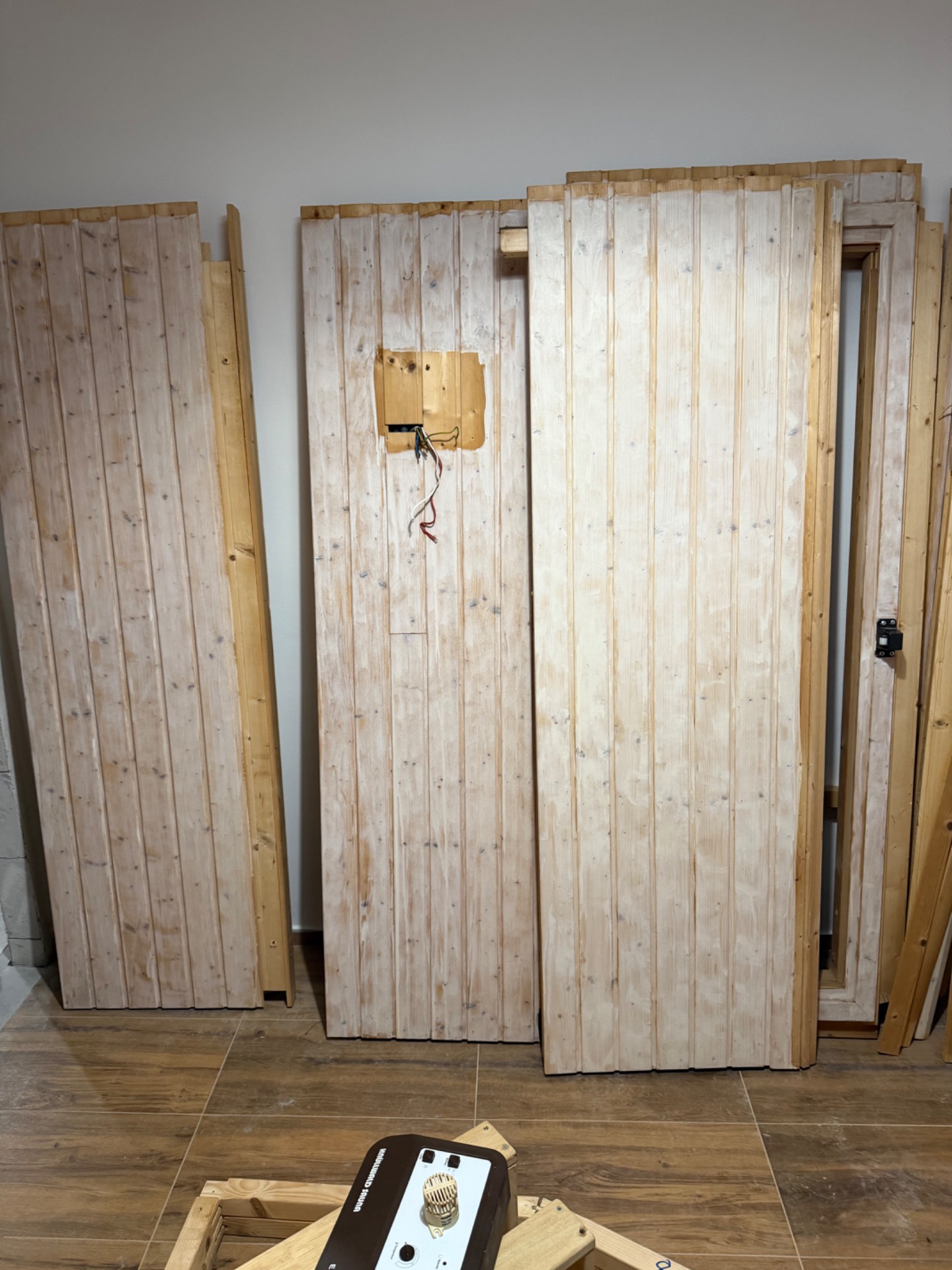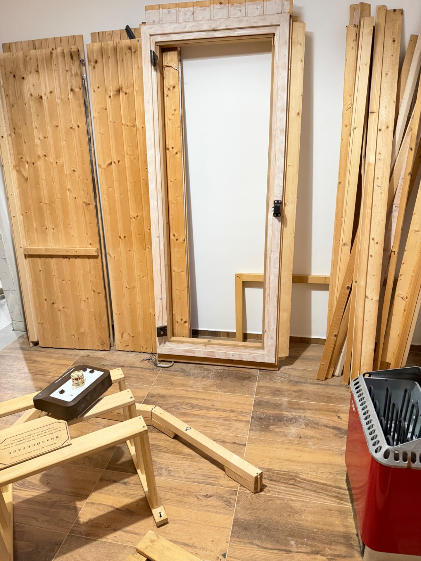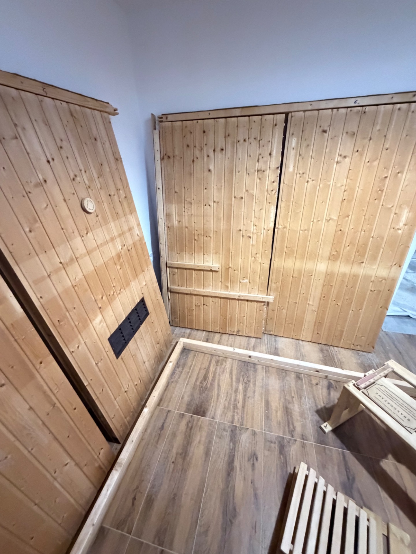 Kompletní demontovana sauna.Postavení vyžaduje zručnost.Predni steny bílá barva(jde dobre zbrousit.Kamna 6kw/380v s externím ovladačem a čidlem.Dveře bezpečnostní sklo bronz.Součástí rohož,opěrky zad,lehátka,přesýpací hodiny,opěrky hlavy.