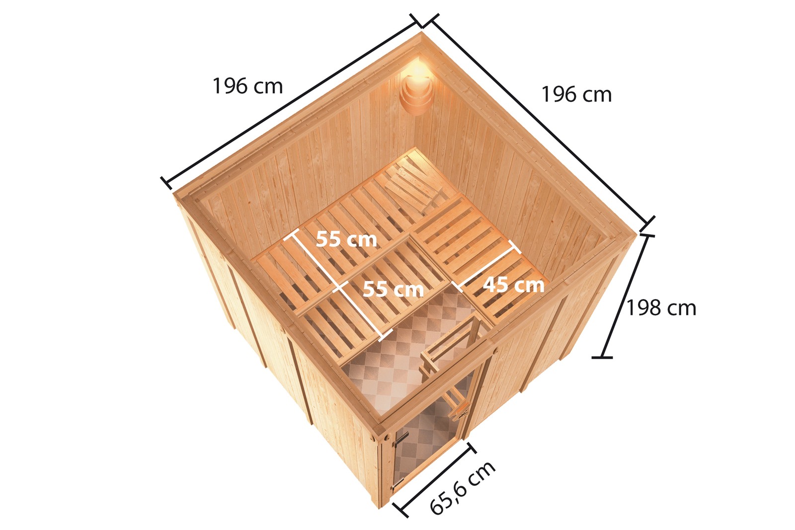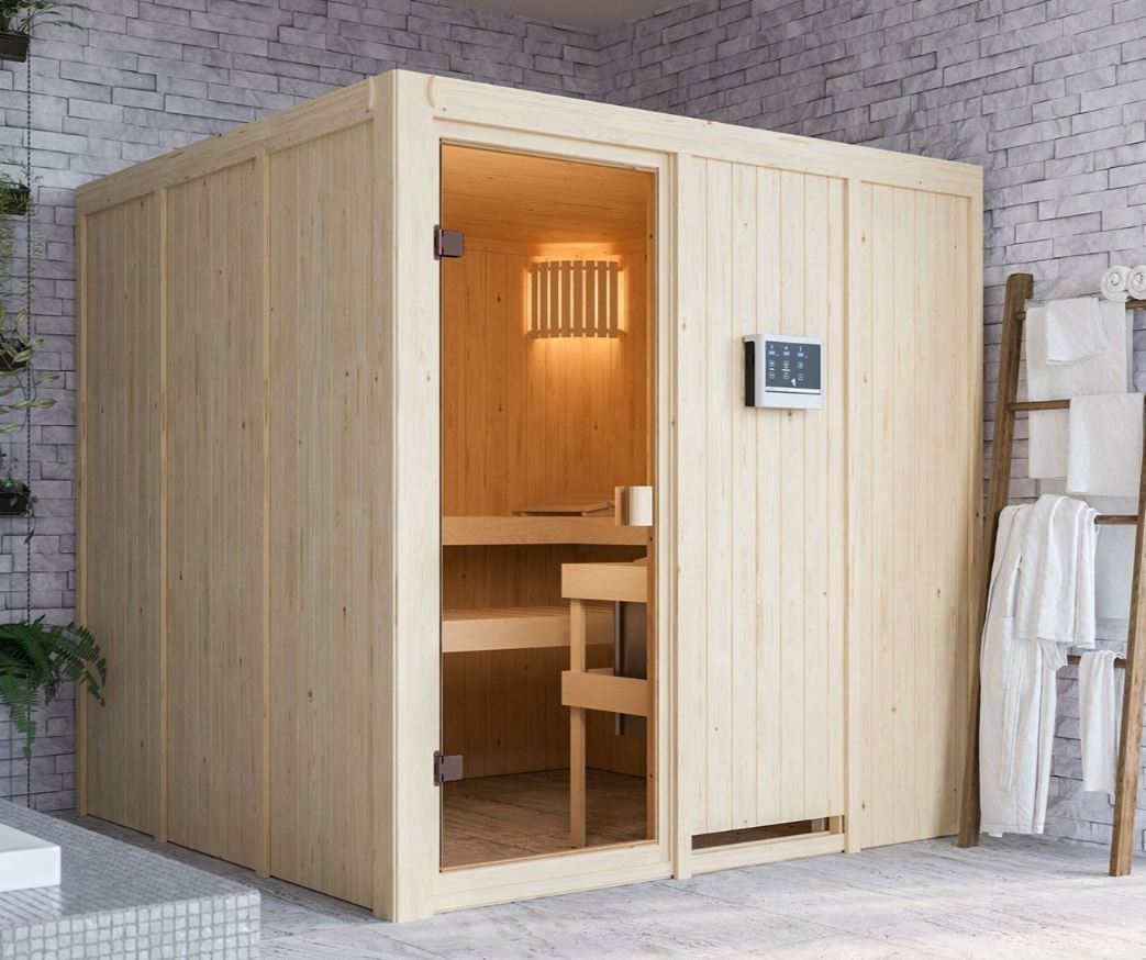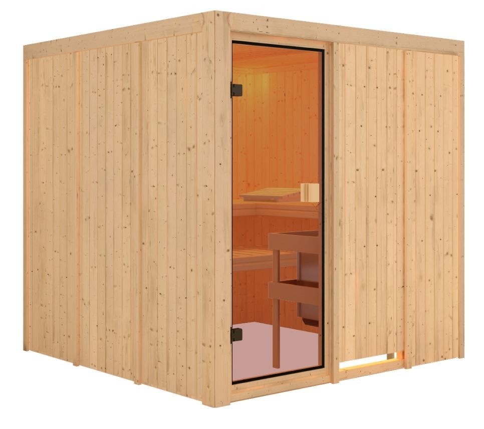 Finská sauna Oulu vyrobená ze severského smrku o tloušťce 68 mm.Kamna Vevor 9 kw s externím ovládáním.Lávové kameny.Sauna je sestavena pomocí jednoduchého modulárního systému, který umožňuje rychlou a snadnou montáž.S vnějšími rozměry 196 x 196 x 198 cm (Š/H/V) nabízí tento model sauny dostatek prostoru pro relaxaci a pohodu.Tři saunové lavice ze severského smrku poskytují možnosti sezení nebo ležení.Součástí dodávky je kryt topení, který vás chrání před popáleninami od horkého topení. Bronzově tónované celoskleněné dveře z tvrzeného bezpečnostního skla s magnetickým uzávěrem utěsňují kabinu sauny a zabraňují ztrátám tepla. Vytvořte si vlastní saunovou oázu s masivní dřevěnou saunou Oulu – za férovou cenu bez kompromisů v kvalitě.Vnitřní osvětlení není součástí.